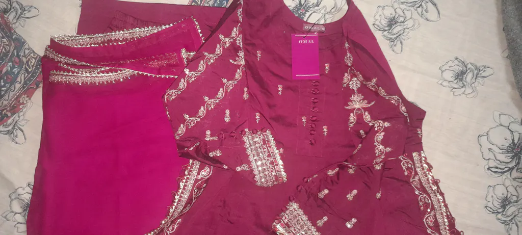 Zeenia is a 3-piece outfit in plum color, featuring a long paneled shirt. The shirt bodice features a round neck, floral chann embroidery, and potli button details, while the paneled flare is heavily embroidered at the side slits. The high side slits have a unique tassel tie detail. The daman of the shirt has signature lappa details. Sleeves feature heavy embroidery with potli button details at the cuffs. Side slits and sleeves are finished with red chatapati and samosa lace. The shirt is paired with plain culottes. The dupatta is chiffon with embroidered borders and samosa lace details.
