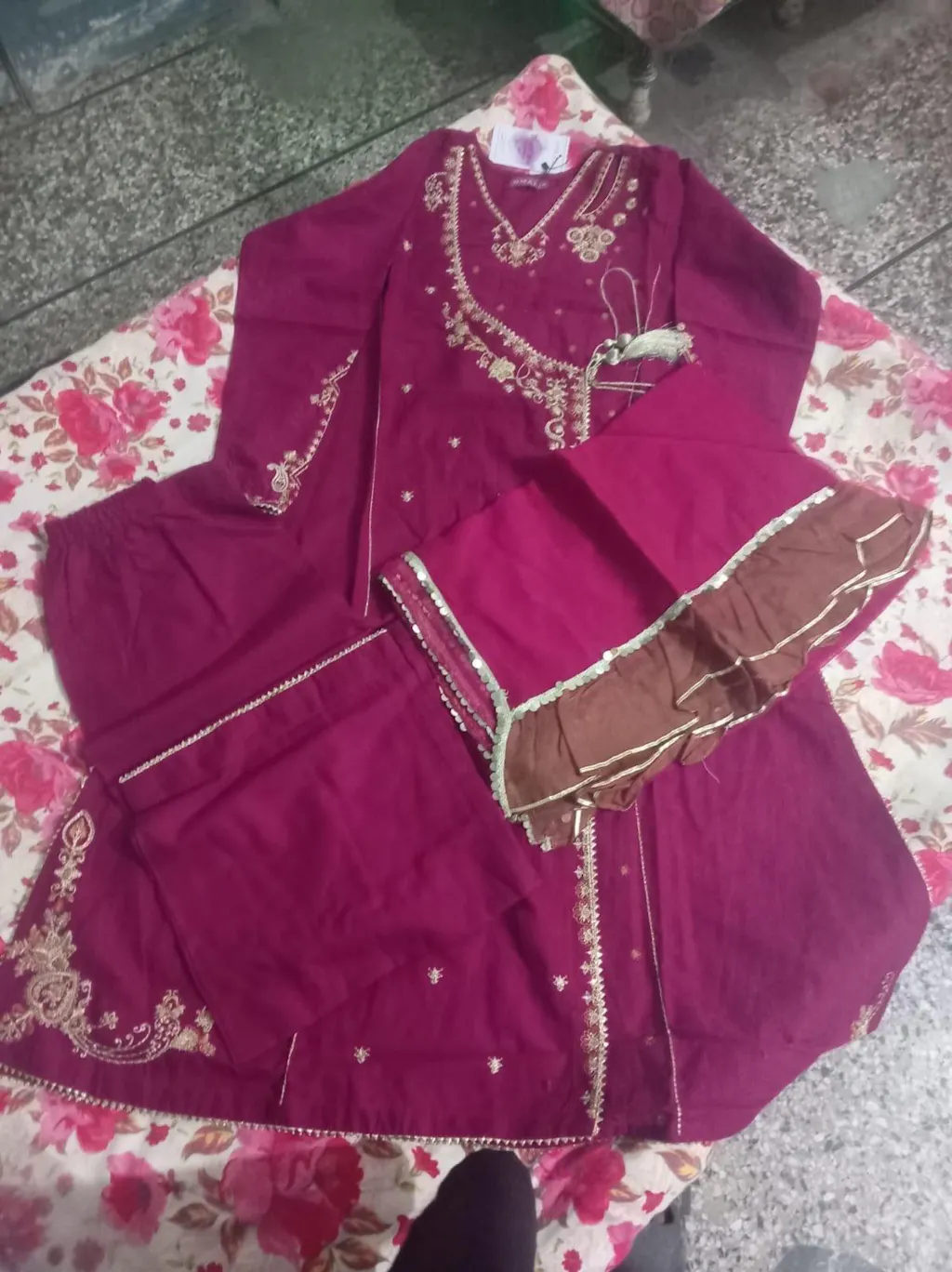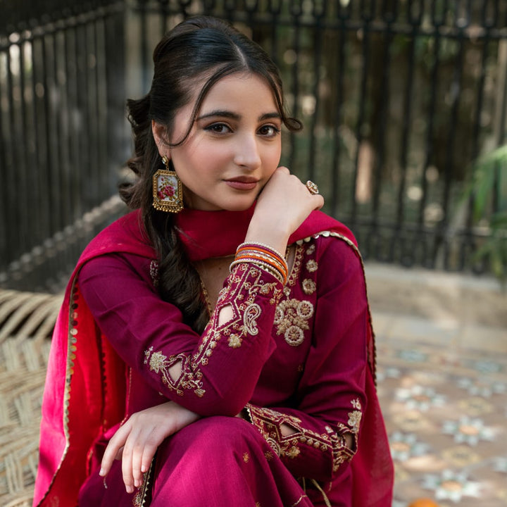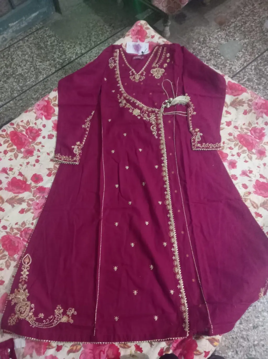 Shirt: Plum khaddar long kalidar angrakha with intricate embroidery, slit on neckline, dori tassels on front and cutwork details on sleeves.
