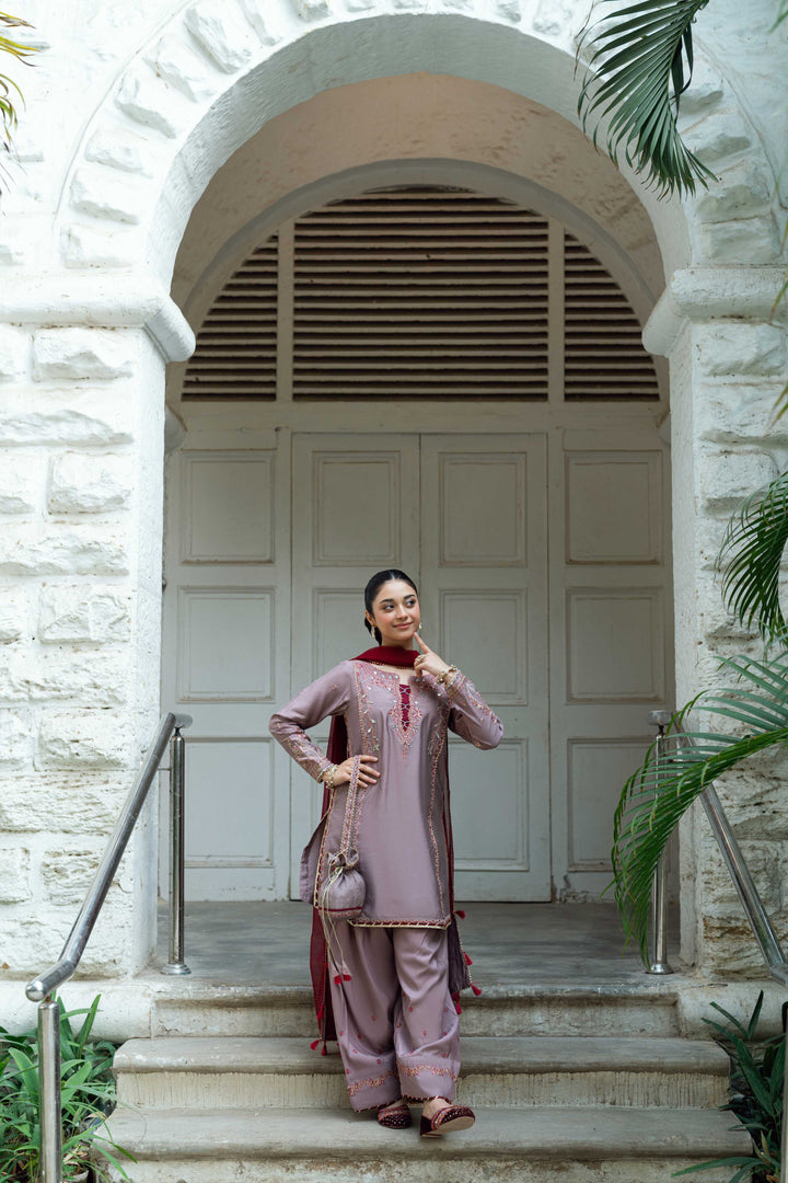 Potli:Matching mauve embroidered tissue organza potli with tassels.
