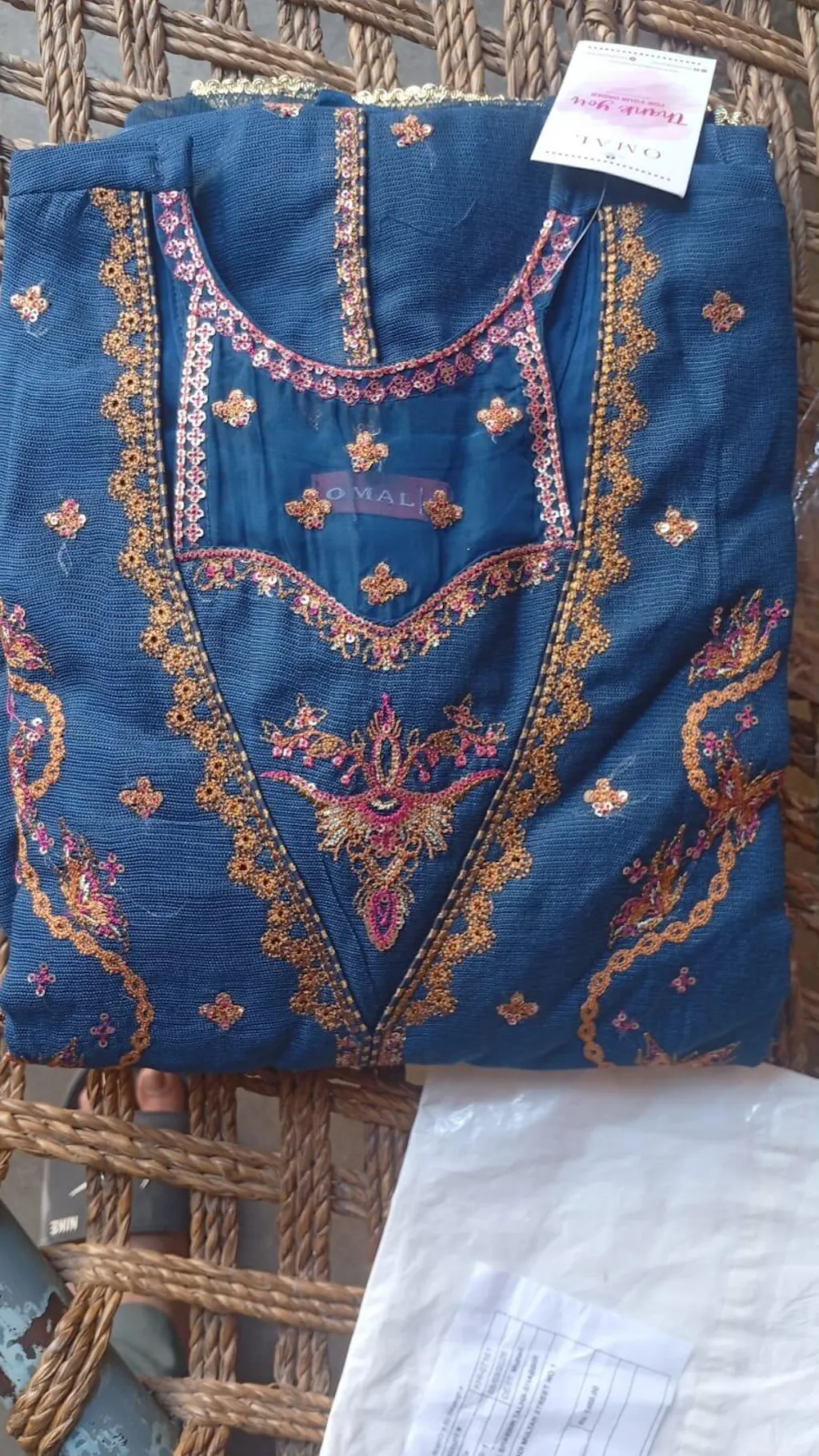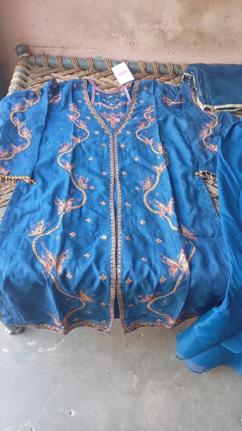 Shirt:Navy blue khaddi net front open long shirt with butterfly themed embroidery design, organza patchwork and slits on the neckline, flowy embroidered bell sleeves finished with crystals lace and pipin detail on chak daman.