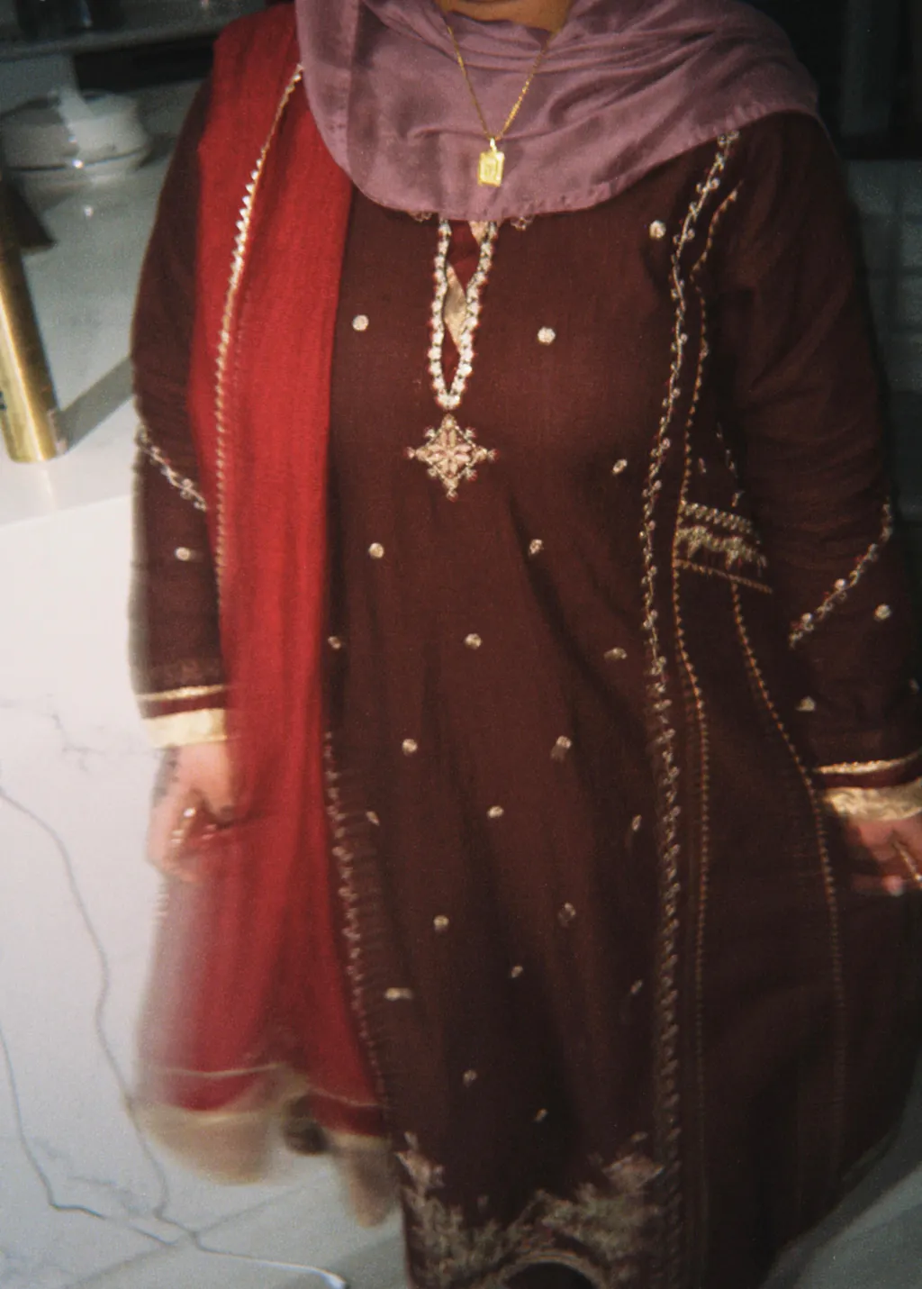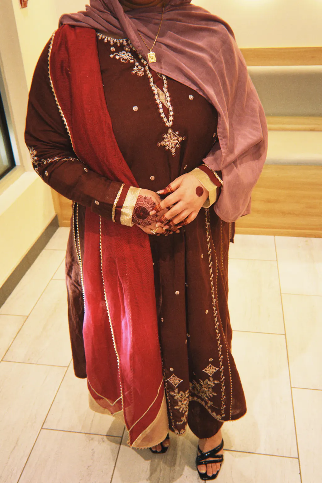 Shirt: Brown khaddar long kalidar embroidered shirt featuring embroidered side panel cut with zari and gota details, chatapatti details on neckline with maysuri touching.