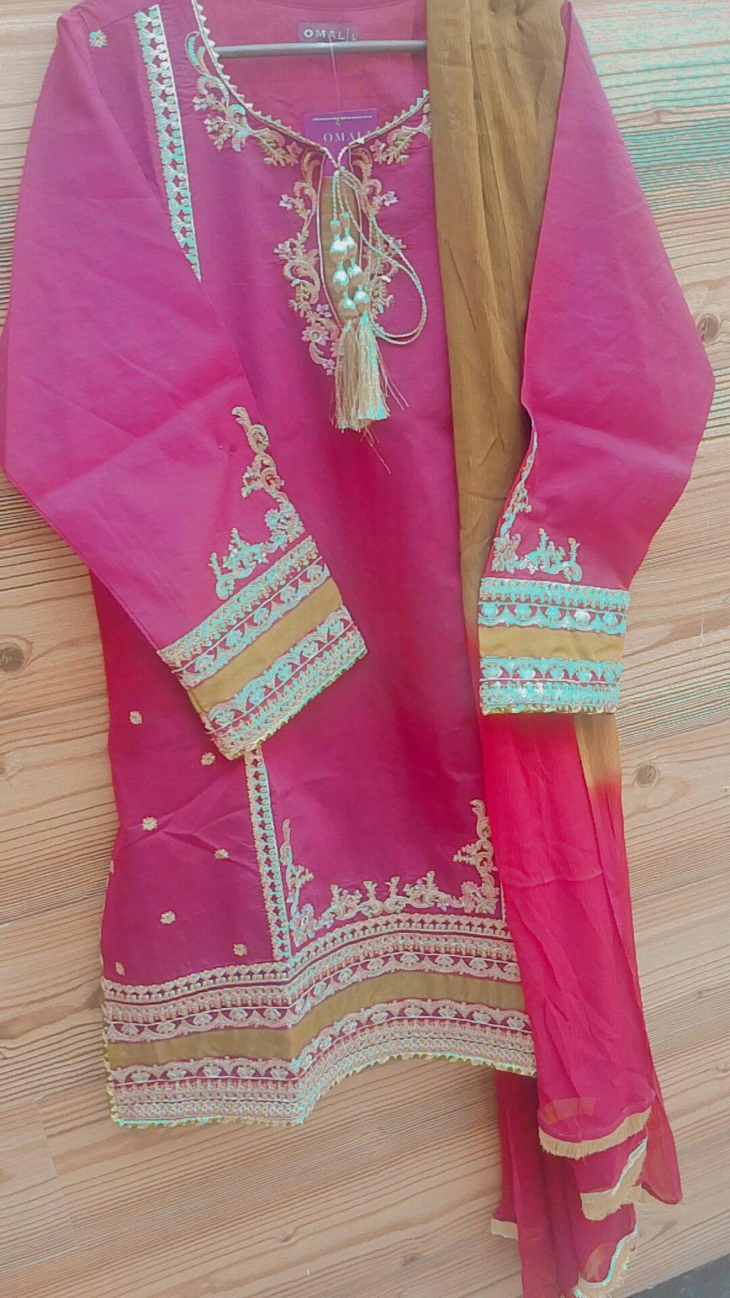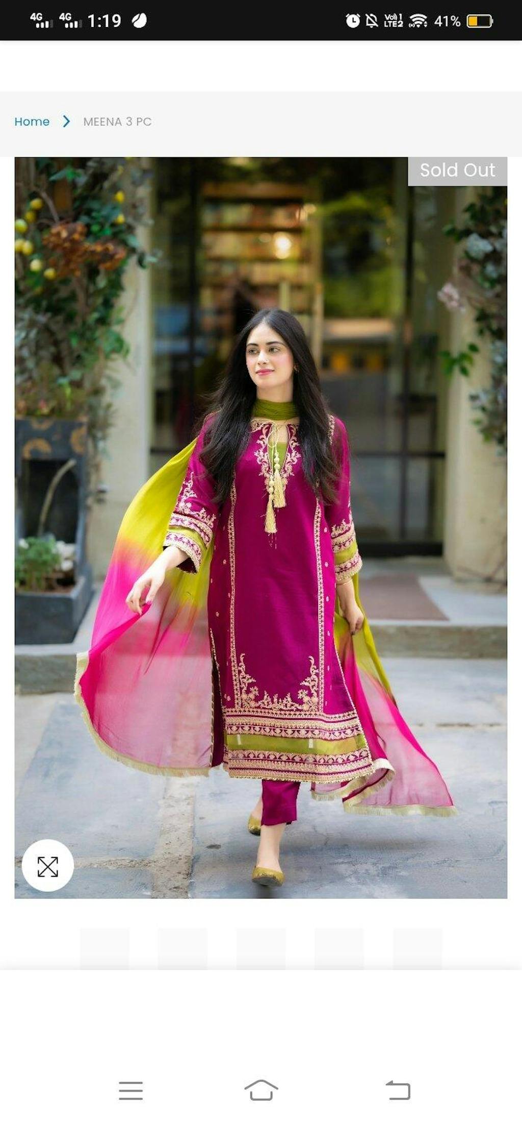 Meena is a straight shirt with floral embroidery details and different embellishments. The sleeves and daman are embroidered and finished with multiple laces. A traditional dip-dyed dupatta and matching straight pants are paired up to compliment the overall Meena look.