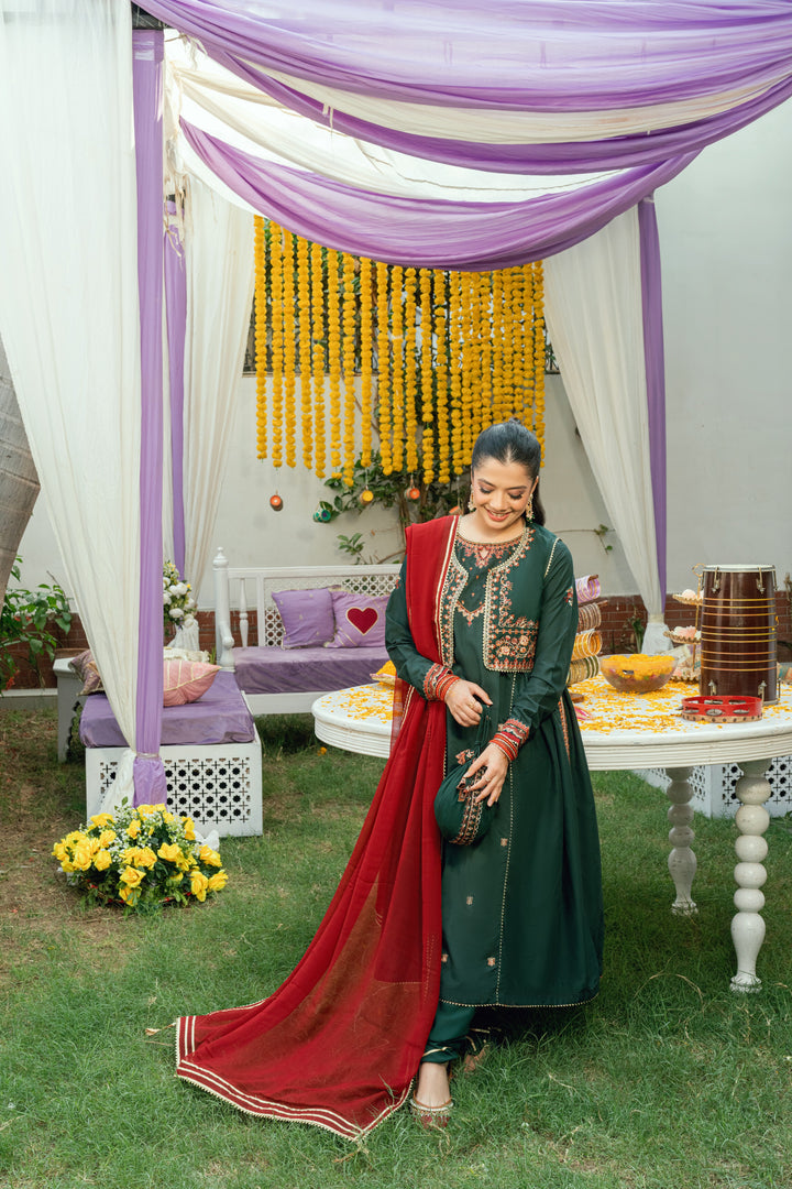 Design: Bottle Green Dobby Shirt: Poly Jaquard deep bottle green embroidered flare paneled shirt with Round neckline with embroidered cut detail, Fitted sleeves with statement embroidery and pleats on panels to add flare with gota and paltawa finishing. Koti: Cottonsilk heavy embroidered koti with gota laces and cute heart cut detail on back Dupatta: Chiffon contrasting maroon dupatta with gota and masuri fabric tassels Trouser: Cottonsilk churidar pajama with gota lace detail