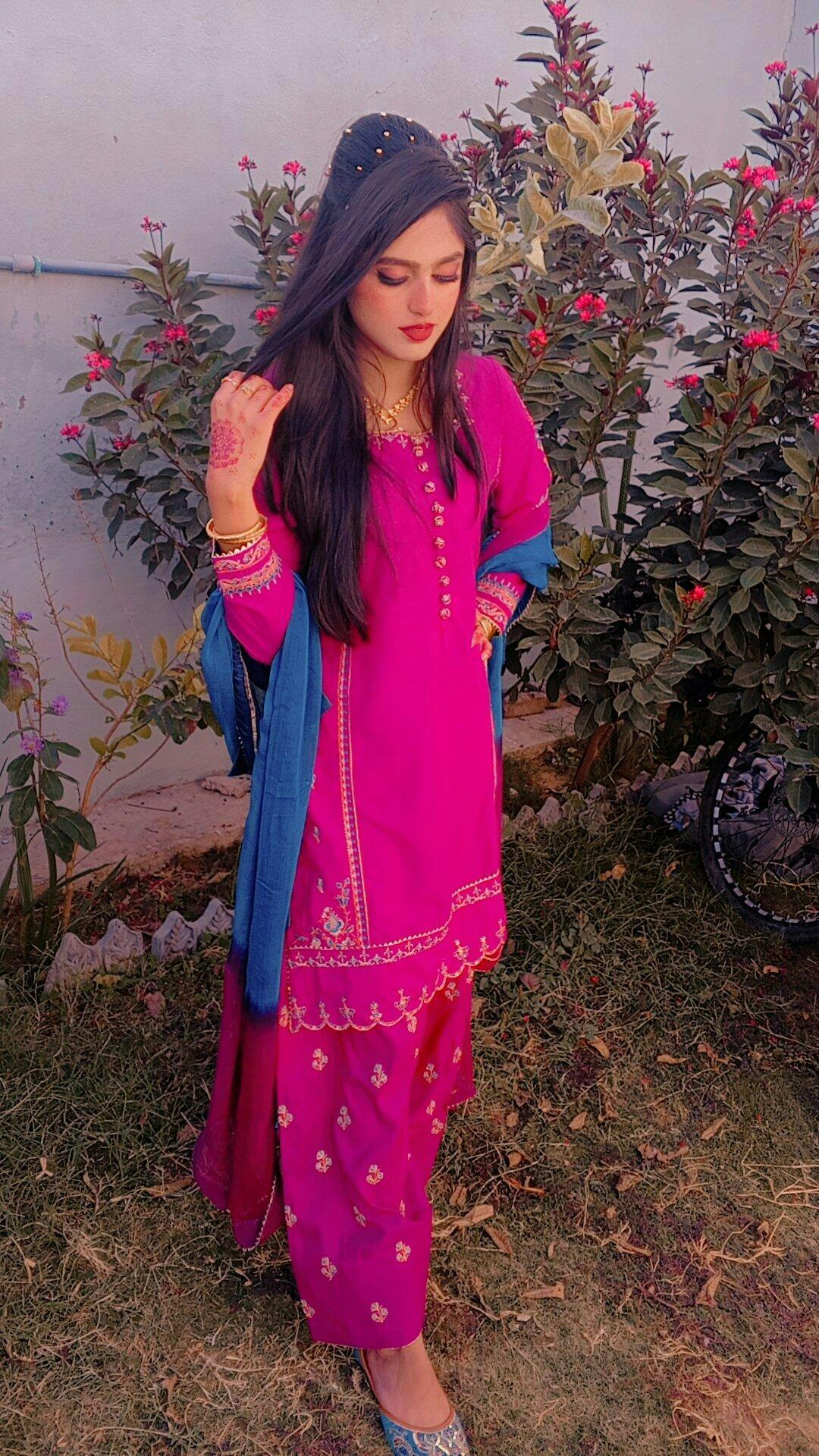 Design: Plum Dobby Shirt: Poly Jaquard deep plum embroidered princess paneled shirt, Square neckline with embroidered buttons detail, Fitted sleeves with statement embroidery and scallops detail on hem with gota and paltawa finishing Dupatta: Chiffon dip dyed two color dupatta with gota and fabric triangles Trouser: Rawsilk matching plum embroidered Farshi shalwar with lace detail.