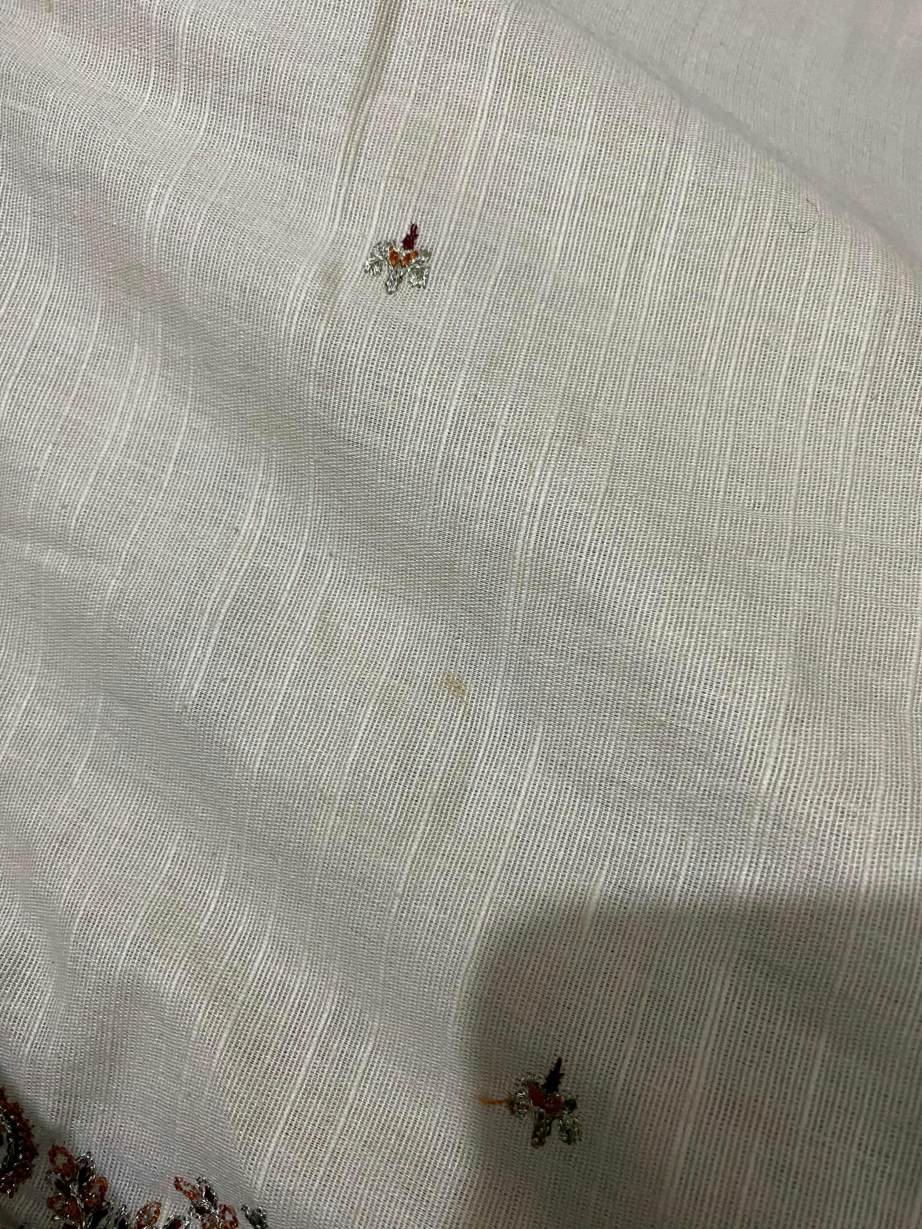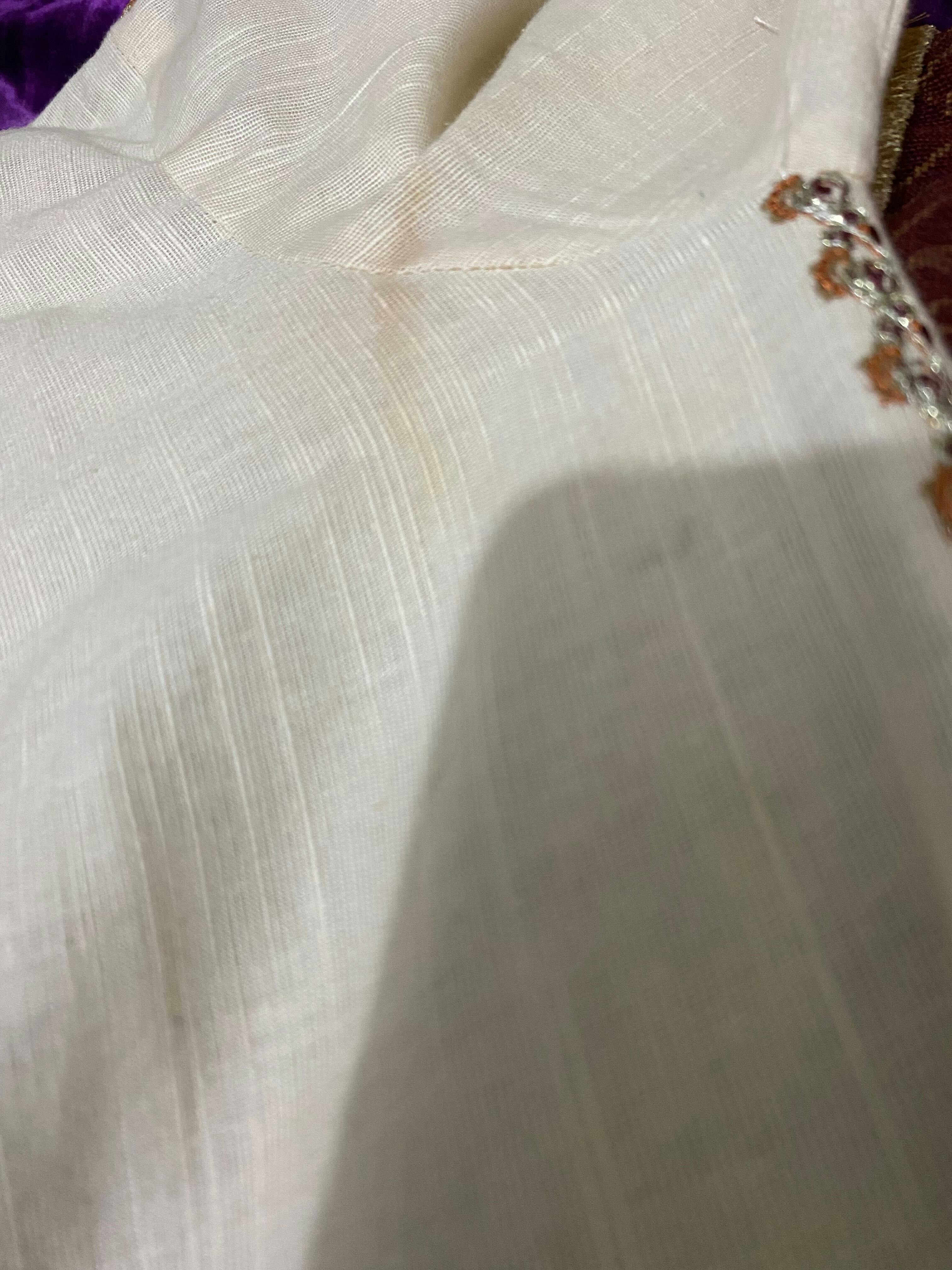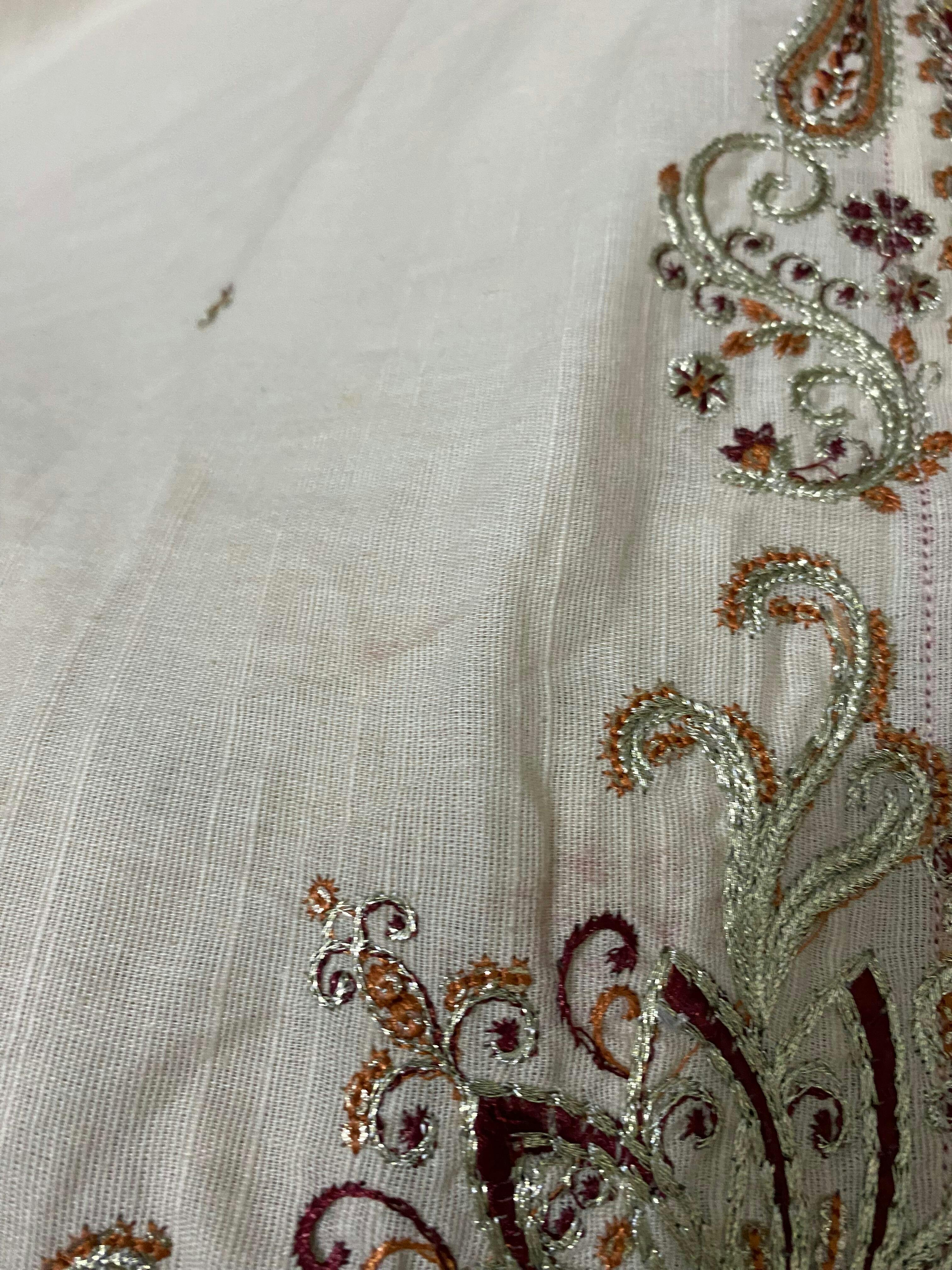 Shirt: Off white khaddar short embroidered shirt inspired by kashmiri paisleys embroidery, beautiful neckline and round hem with bell sleeves embellished with maroon thread tassels and gota finishing.